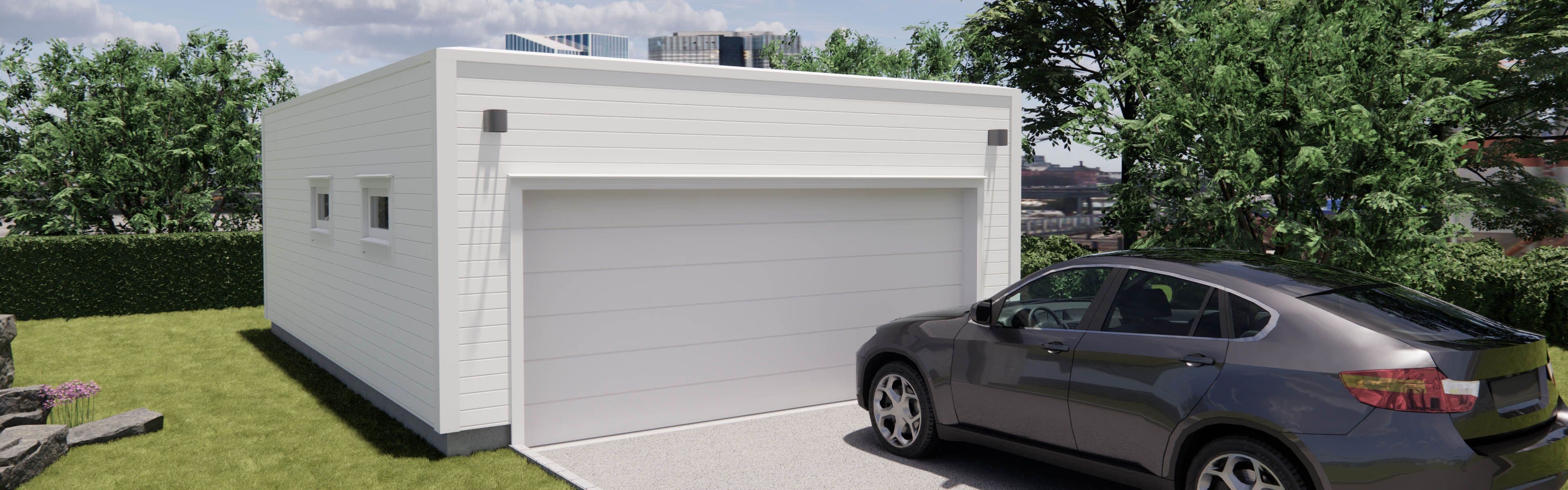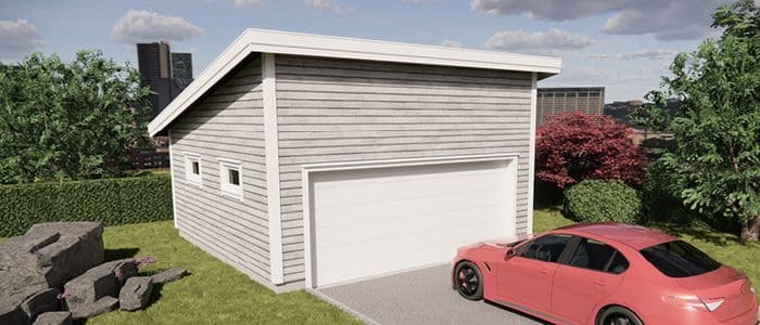 Stryn 1: Dobbelgarasje med bod, flatt tak